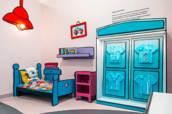 Kiciokociolandia została pomyślana jako przestrzeń 3D, w której sceny znane z książek przenoszą się do prawdziwych sal. Zamiast biernego oglądania są tu interaktywne elementy, a każdy fragment wystawy ma prowadzić najmłodszych przez codzienne sytuacje dobrze znane z serii o Kici Koci.