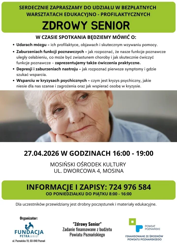 Gdy codzienny niepokój nie mija, a zwykła rozmowa nie wystarcza, w powiecie poznańskim działa wsparcie, które nie kosztuje ani złotówki. Program „Zdrowy Senior” ma odciążyć starsze osoby i ich rodziny w momentach, gdy ciężar spraw życia codziennego robi się szczególnie dokuczliwy. Pomoc skierowano do mieszkańców powiatu w wieku 60 lat i więcej, zwłaszcza tych po stracie bliskiej osoby, zmagających się ze stresem, bezsennością, napadami paniki albo poczuciem bezsilności. W najbliższych dniach odbędą się też spotkania edukacyjno-profilaktyczne w Rokietnicy i Mosinie.